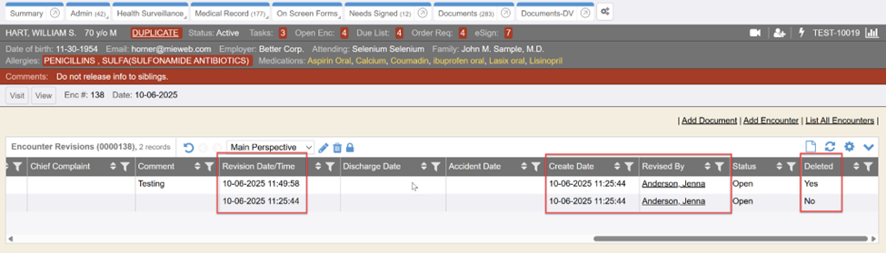 When under the Encounter tab on the Patient Chart, you can now see additional revision data. You can see the date/time of the revision and who revised it. Now it should be much clearer when an Encounter is deleted, who deleted it and when that occurred.