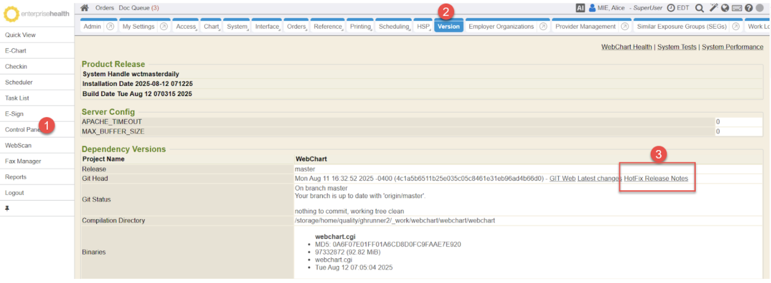 Hotfix Release Notes are now available on the Version tab (Control Panel->Version). Release Notes will continue to be emailed to System Administrators on the hotfix notes email distribution list. If the Version tab does not display in your database, please contact your implementer for assistance installing it.