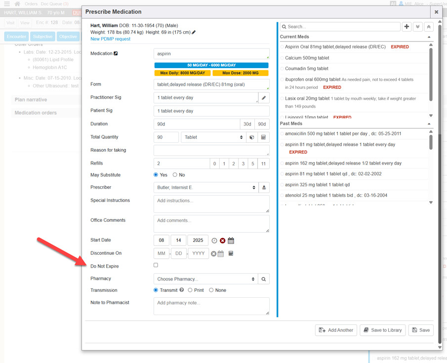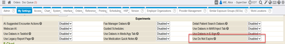 When prescribing, providers can now mark the medication as “Do Not Expire” in order to prevent the medication refill from expiring. The “Use Do Not Expire” feature is available in the My Settings Experiments section and is disabled by default. Users interested in utilizing this feature may enable this feature if desired.
