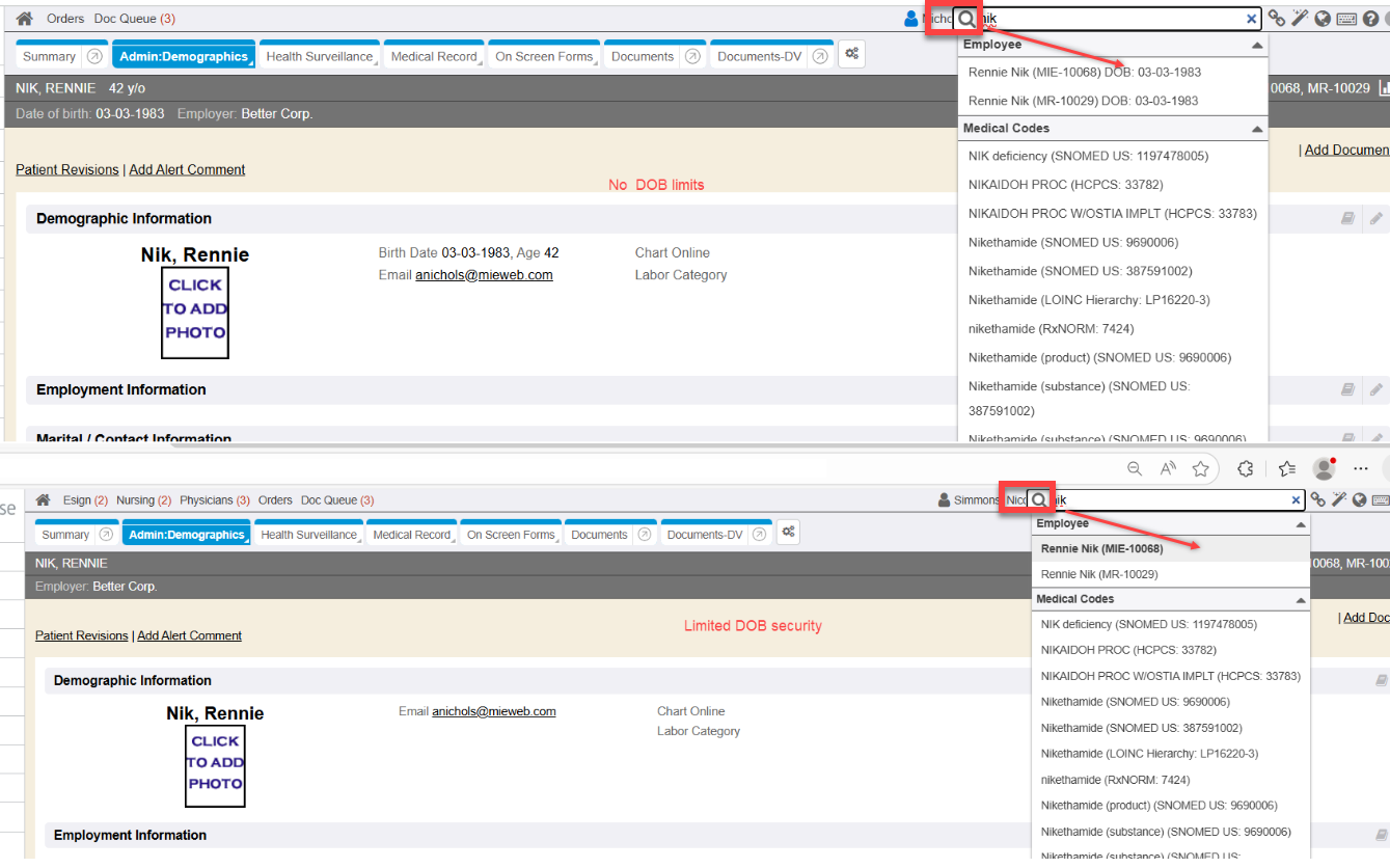 - If a user has Limit DOB = No, then when performing a super search, any chart matches will also display DOB (date of birth) in its search results.