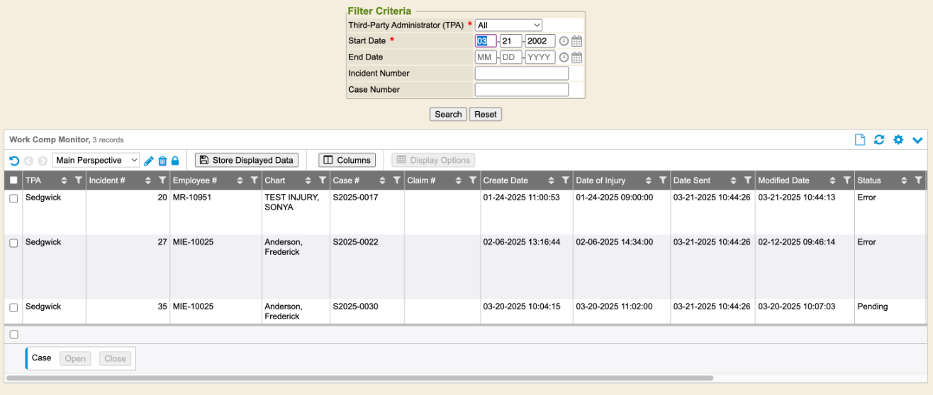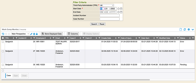 The Work Comp Monitor Report is for monitoring work comps claims that are sent to TPAs (Third Party Administrators). This report is used to make sure all work comp claims are successfully processed and sent to the TPA and will display any claims pending, errored, processed and sent.